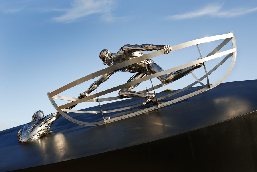 The sculpture: 316 stainless steel – boat 4.5m long, figures 2.7m long.